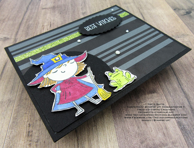 The most complicated thing about this card design is probably the coloring and fussy cutting of the witch and frog images. They were also probably the most fun. I loved playing with different colored Stampin' Blends Markers including Orchid Oasis, Pumpkin Pie, Daffodil Delight, Party Parakeet, Soft Sea Foam and Blackberry Bliss. The striped design was perfect for the background and really pops against the Basic Black card base. For a touch of bling, I added a strip of the Old Olive Glitter Washi Tape and added the sentiment label over the top. I heat embossed the sentiment with Silver embossing powder to step up the design and added some Basic Rhinestone Jewels for a touch of bling. To help the witch stand out, I added a Basic Black cardstock circle behind her and trimmed the edges flush with the designer series paper. I love how this card turned out and I can't wait to try other color combinations to see what I can create with these wonderful products.
