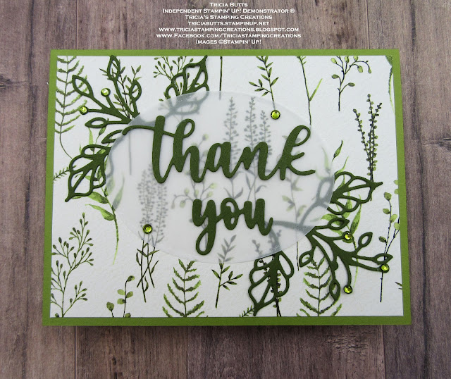 This pretty monochromatic card design focuses on the beautiful designer series paper background and the assortment of die cuts that help create the focal design. I chose Mossy Meadow and Old Olive from the colors used in the designer series paper to create this card. I chose to use the Lovely Layers Vellum for the oval because I love the size of the pieces of vellum in this pack. It's a wonderful way to have a supply of vellum on hand ready to use. For the sentiment, I trimmed the Thanks die cut to remove the "s" and then adhered it and the You die cut to the vellum oval. Using Mini Glue Dots, I attached the vellum oval to the designer series paper card front, hiding the Glue Dots behind the letters so that they don't show through the vellum. I added the die cut leaves to the top left and bottom right corners of the vellum oval, hiding the ends of the stems behind the sentiment letters. To complete the design, I colored several Basic Rhinestones with the Dark Old Olive Stampin' Blends Marker and added them to the vellum oval and several of the leaves. This clean and simple Thank You card has an elegant feel to it that would also work for other occasions.