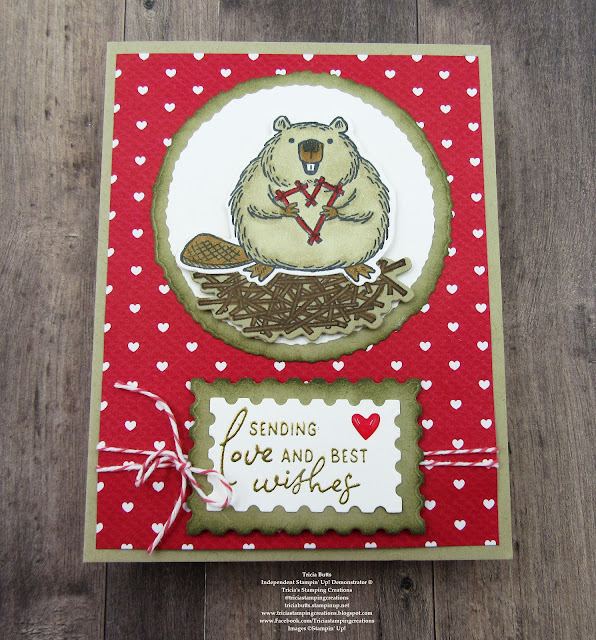 For today's card design, I chose to use the cute beaver image holding a stick heart. I thought it would be a sweet focal image for my Valentine's card. I also used the nest image to help ground him inside the Basic White circle die cut with the Deckled Circles Dies. I colored the images with Stampin' Blends Markers and added the images to the circle using Stampin' Dimensionals to pop them up. I used a larger Crumb Cake deckled circle to frame the focal circle and I sponged the edge of the circle with Crumb Cake Classic ink using a Sponge Dauber. For the sentiment, I heat embossed the image with Gold embossing powder onto Basic White cardstock and used the Perennial Postage Dies to die cut it out. I layered it onto the slightly larger Crumb Cake label, which also has the edges sponged with Crumb Cake Classic ink. Using Sweet Sorbet Baker's Twine, I wrapped a piece around the card front twice and tied a bow on the left side. I added the sentiment over the top of the twine with Stampin' Dimensionals and attached the focal image above the sentiment, making sure to center both of them. To finish off the design, I added a red heart from the Adhesive Backed Hearts & Flowers to complete the design. I had so much fun creating this sweet card design and hope it will help bring a smile to someone special.